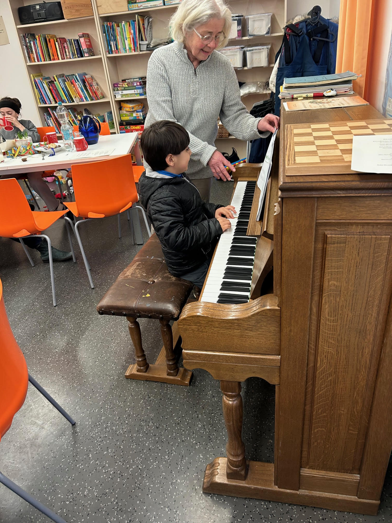 So auch am 25. Januar. Wie immer waren es die Kinder, die zuerst kamen und schon mal neugierig das Büfett inspizierten. Etliche Gäste brachten Kuchen und Keksspenden mit, sodass ein überreichliches, sehr verlockendes Büfett entstand. Nach der ersten Kaffee-/Kuchenrunde führten mehrere Kinder ihre Klavierkünste vor. Eine versierte Klavierlehrerin, Mitglied unserer Initiative vom ersten Tag an, bietet ihnen einmal/Woche Unterricht im Gemeinschaftsraum an – mit schönen Erfolgen. Es berührt schon, das Spiel selbst kleinerer Kinder, ernsthaft und mit Ehrgeiz vorgetragen, anzuhören und -zuschauen.